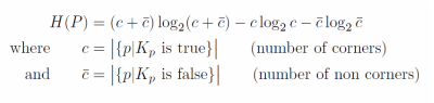 - ID3 알고리즘은 엔트로피 최소화 원리로 작동합니다. 최소 쿼리 수로 실제 클래스(관심점 유무)를 찾을 수 있도록 16 픽셀을 질의합니다. 또는 픽셀 p에 대한 정보가 가장 많은 픽셀 x를 선택합니다. 집합 P의 엔트로피는 수학적으로 다음과 같이 나타낼 수 있습니다.