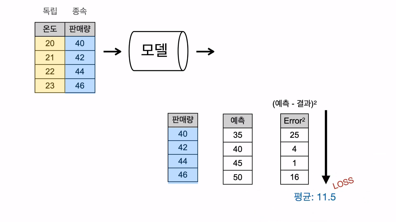 3. 모든 종속 변수와 예측 결과의 차이를 제곱하여 평균을 구한 값이 Loss이다.